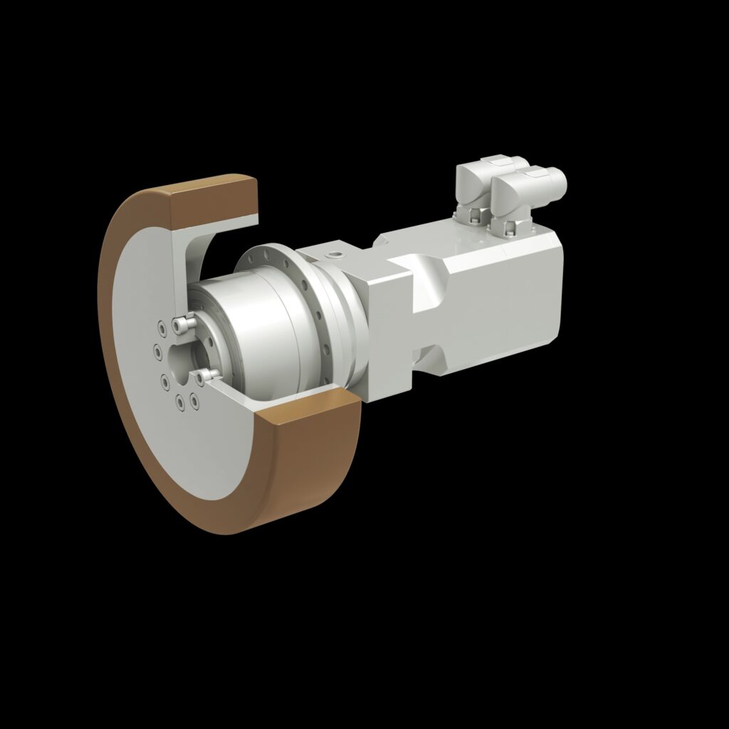 The BlueRoll is a wheel-mounted gearbox, specifically developed to meet the requirements of the AGV sector, delivering excellent position accuracy and high energy efficiency for long operating cycles. This gearbox is almost completely enclosed by the wheel and can be fitted directly to the chassis of the vehicle, making installation easy. The integrated wheel is supported directly by reinforced gearbox bearings, which permit ultra-high radial forces. It’s available in various sizes to meet load requirements, and reaches a speed of up to 2 m/s. With its compact axles and flat design, the BlueRoll is a space-saving solution.